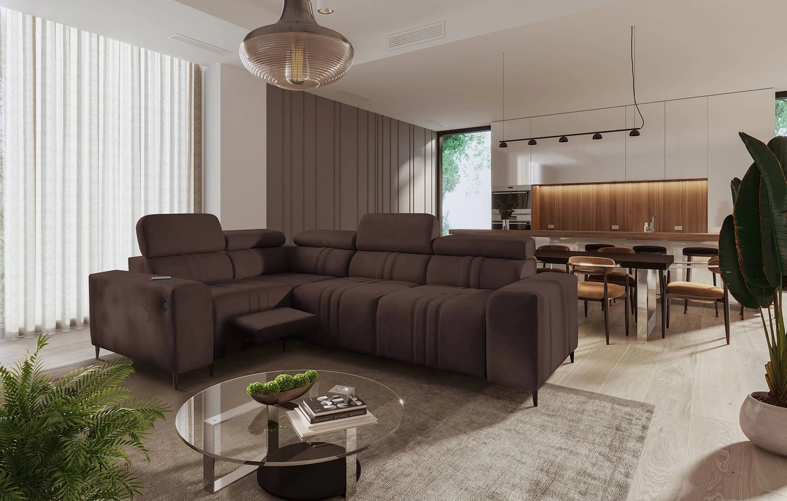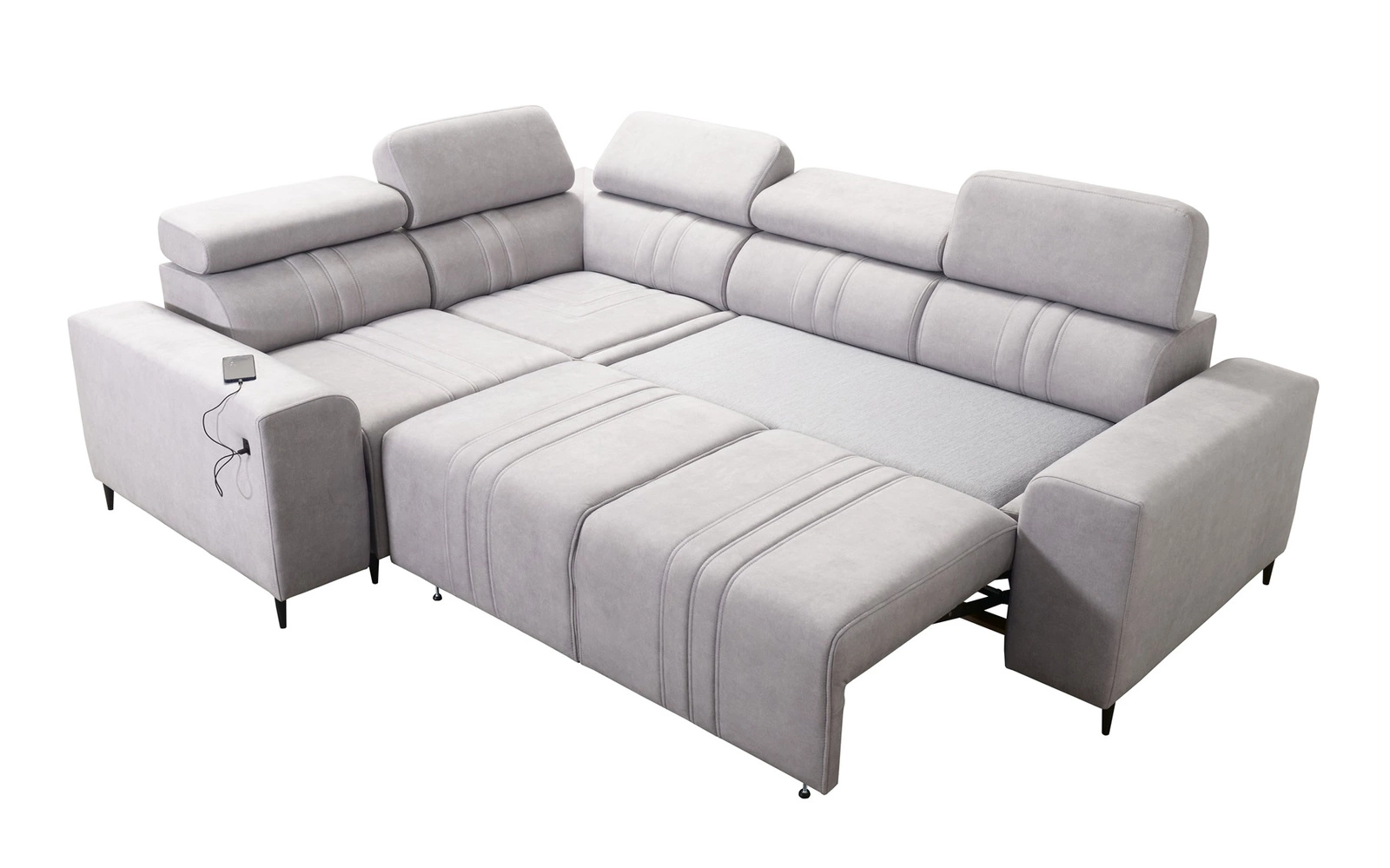 Dodatki tego mebla, które docenią wszyscy użytkownicy to wysuwany podnóżek, regulowane zagłówki oraz gniazdo ładowania USB w boczku narożnika.