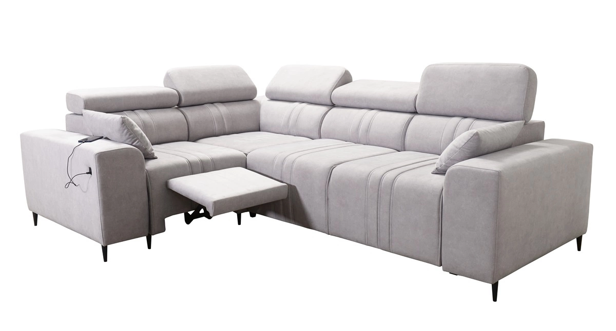 Dodatki tego mebla, które docenią wszyscy użytkownicy to wysuwany podnóżek, regulowane zagłówki oraz gniazdo ładowania USB w boczku narożnika.