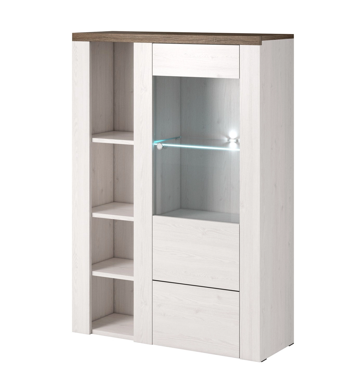Przeszklone fronty witryn pozwolą wyeksponować dodatki stanowiące dekorację salonu. Nowoczesna meblościanka do salonu wykonana została z wysokiej jakości płyty laminowanej o grubości 15mm, która charakteryzuje się odpornością na wpływ czynników zewnętrznych takich jak obicia, uderzenia i niefortunne zadrapani. Wnętrze witryn częściowo wyposażono w szklane półki z wytrzymałego szkła hartowanego.