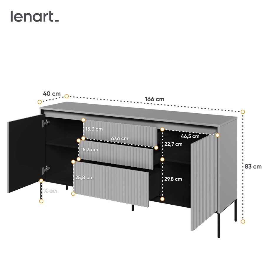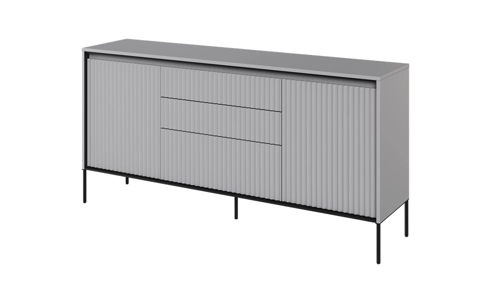Ryflowane fronty zostały wykonane z płyty MDF o grubości 18mm. Korpus wykonany z wysokiej jakości płyty laminowanej, która charakteryzuje się odpornością na wpływ czynników zewnętrznych takich jak obicia, uderzenia i niefortunne zadrapania. Metalowe nogi w kontrastowym czarnym kolorze nadają wizualnej lekkości przy jednoczesnym utrzymaniu funkcjonalności.