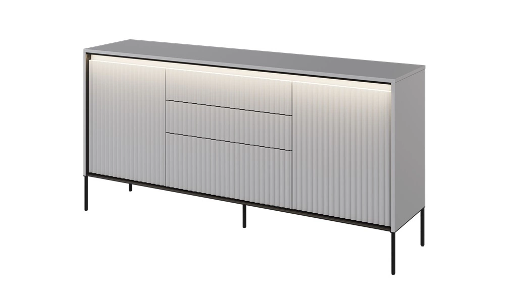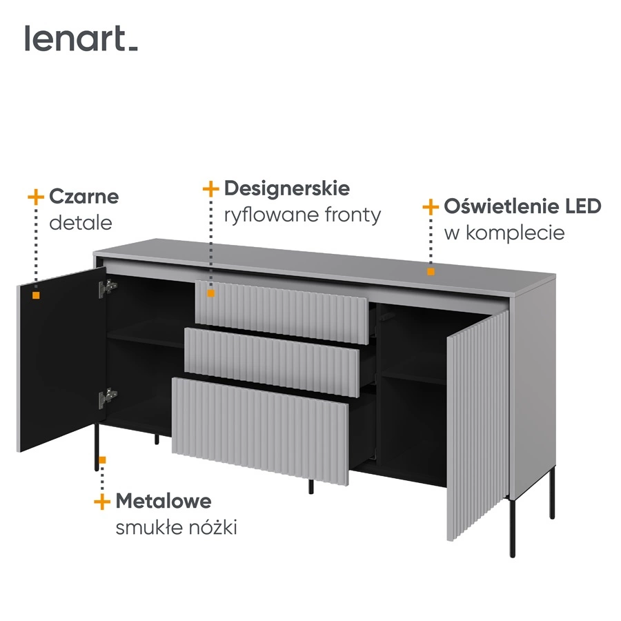 Komoda z szufladami Trend 166 cm szara funkcjonalna komoda o wyjątkowym designie ryflowane fronty z subtelnym oświetleniem