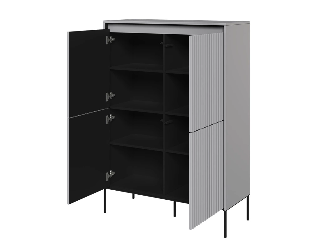 Komoda wysoka Trend łączy w sobie funkcjonalność z niezwykle wyjątkowym designem. Głównym elementem przyciągającym wzrok jest ryflowanie frontów, które uwydatnia subtelne oświetlenie LED. Niezwykłe połączenie szarości w modnym odcieniu z czarnymi dodatkami sprawia, że całość prezentuje się bardzo stylowo. Pojemne, zamykane szafki komody pomieszczą wszystkie rzeczy oraz niezbędne akcesoria. Unikatowe wzornictwo komody sprawdzi się nawet w najbardziej wymagającym wnętrzu.