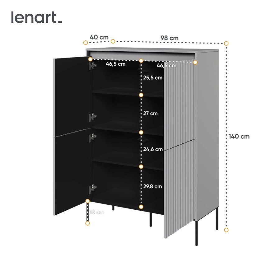 Ryflowane fronty zostały wykonane z płyty MDF o grubości 18mm. Korpus wykonany z wysokiej jakości płyty laminowanej, która charakteryzuje się odpornością na wpływ czynników zewnętrznych takich jak obicia, uderzenia i niefortunne zadrapania. Metalowe nogi w kontrastowym czarnym kolorze nadają wizualnej lekkości przy jednoczesnym utrzymaniu funkcjonalności.