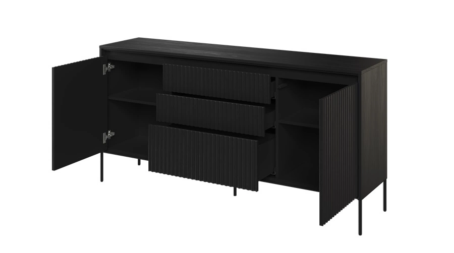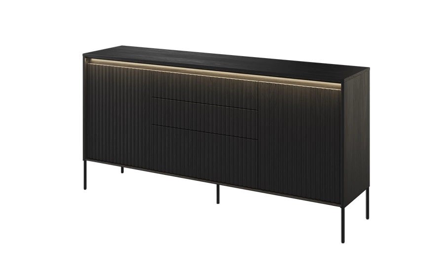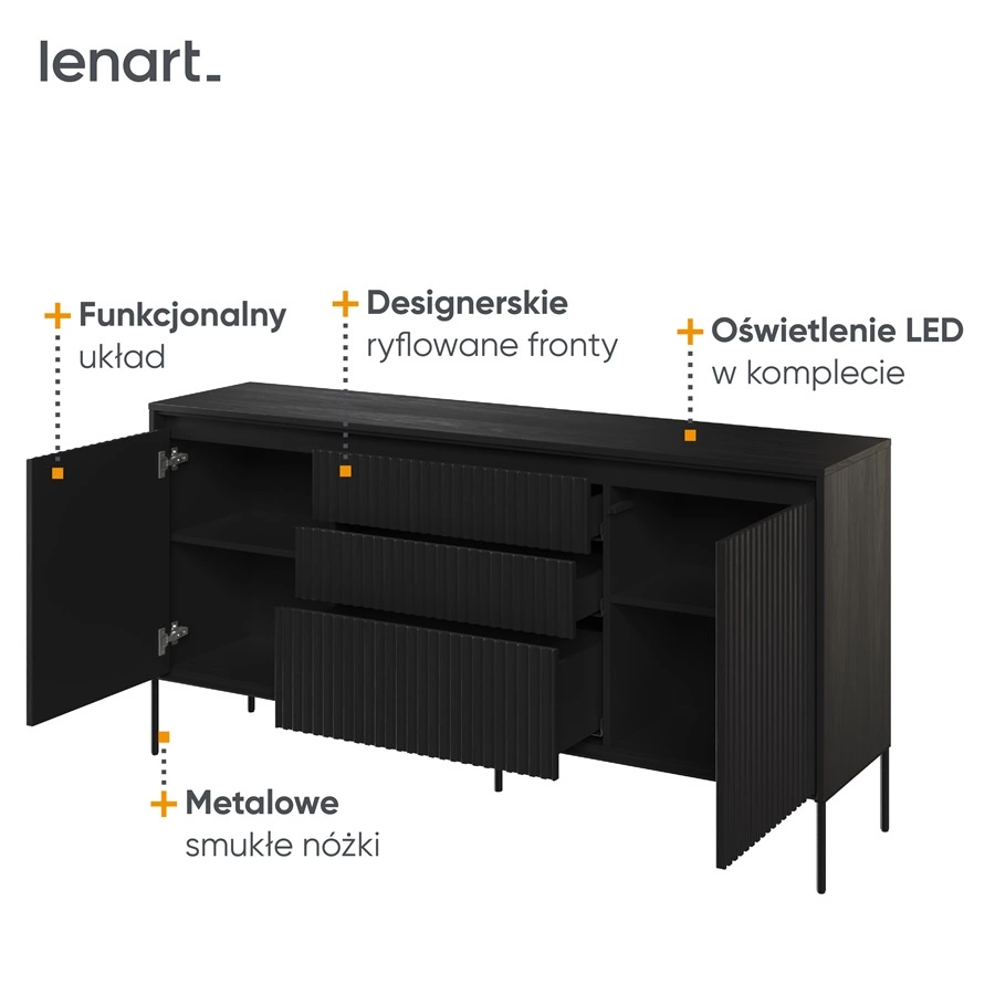 Komoda z szufladami Trend 166 cm czarna funkcjonalna komoda o wyjątkowym designie ryflowane fronty z subtelnym oświetleniem