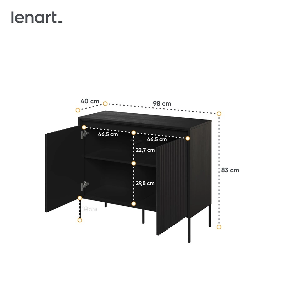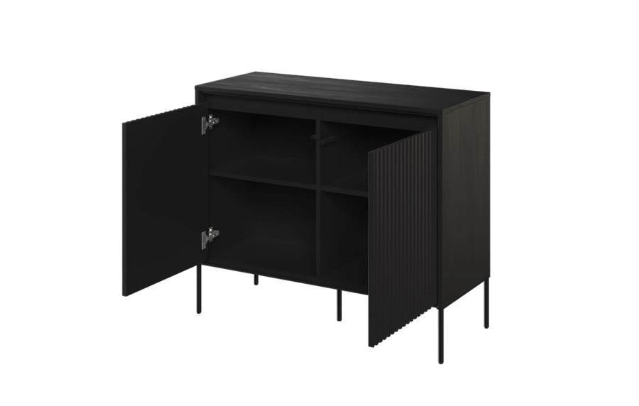 Ryflowane fronty zostały wykonane z płyty MDF o grubości 18mm. Korpus wykonany z wysokiej jakości płyty laminowanej, która charakteryzuje się odpornością na wpływ czynników zewnętrznych takich jak obicia, uderzenia i niefortunne zadrapania. Metalowe nogi w kontrastowym czarnym kolorze nadają wizualnej lekkości przy jednoczesnym utrzymaniu funkcjonalności.