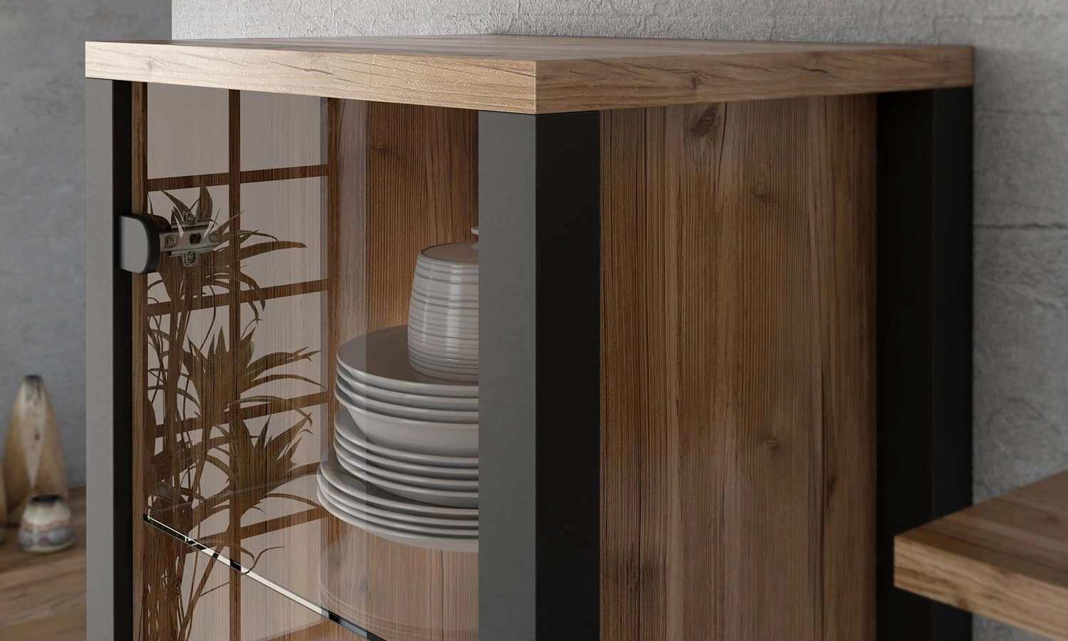 - Witryna Olin to prosty i elegancki design, który wpisuje się w obecne trendy wnętrzarskie. Dębowa bryła w połączeniu z czarnymi elementami dekoracyjnymi sprawia, że całość prezentuje się niezwykle stylowo.