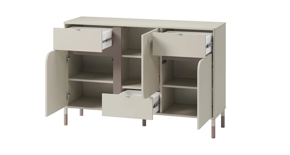Komoda z szufladami Harmony wyróżnia się prostotą oraz elegancją, a także zaskakuje szeroką funkcjonalnością, dzięki czemu komoda dopasuje się do salonu, przedpokoju jak również pokoju nastolatki. Frezowania wybranych frontów podkreśla subtelna kolorystyka w kaszmirowym odcieniu. Metalowe nogi utrzymane w truflowym odcieniu nadają wizualnej lekkości oraz doskonale oddają nowoczesny charakter bryły. Fronty szuflad zostały wzbogacone o minimalistyczne uchwyty krawędziowe, które przyciągają wzrok i stanowią niebanalną dekorację mebla.