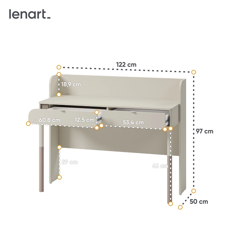 Biurko Harmony w kolorze beżowo-truflowym to wyjątkowy mebel, który świetnie sprawdzi się zarówno w pokoju młodzieżowym, jak i w stylowej przestrzeni do pracy czy nauki. Jego subtelna, ciepła kolorystyka w połączeniu z nowoczesnym designem sprawia, że wnętrze staje się przytulne i harmonijne. Dwie pojemne szuflady zapewniają miejsce na przechowywanie najpotrzebniejszych akcesoriów biurowych, a ergonomiczna konstrukcja z podwyższonym tylnym panelem chroni ścianę przed zabrudzeniem i dodaje całości elegancji. Biurko jest lekkie wizualnie, dzięki czemu idealnie wpisuje się w jasne i przestronne wnętrza.