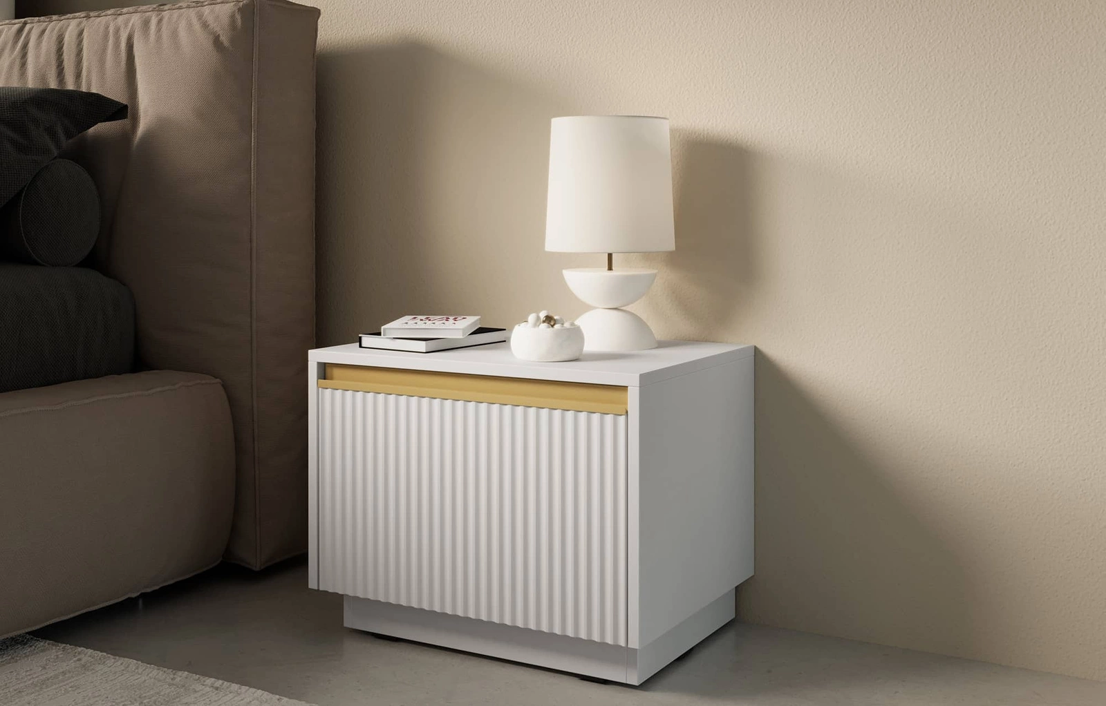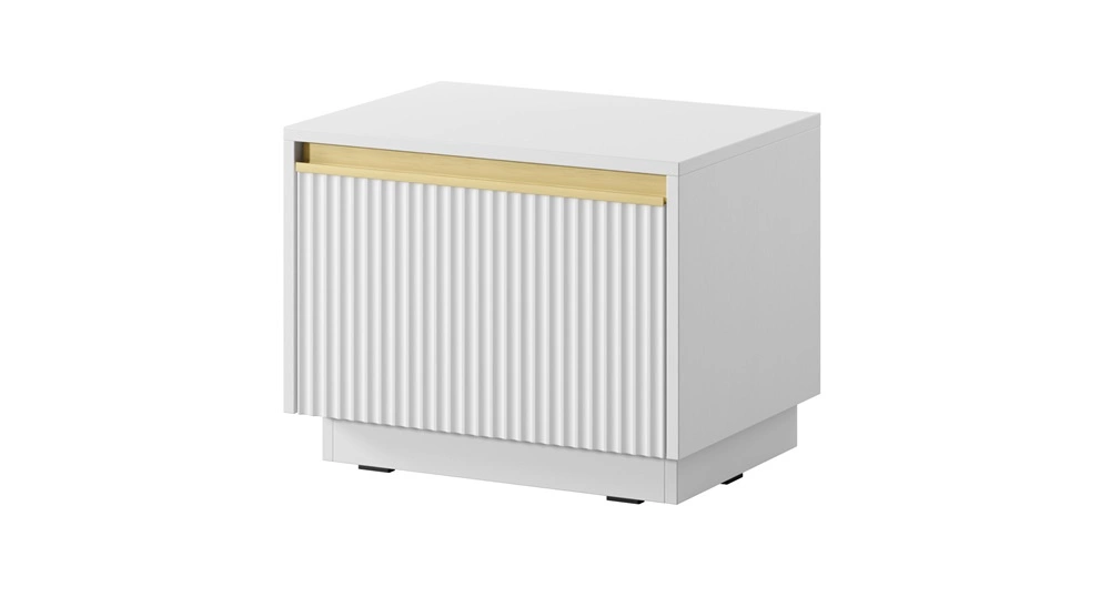 Szafka nocna z szufladą Imperial łączy w sobie funkcjonalność z niezwykle wyjątkowym designem. Głównym elementem przyciągającym wzrok jest elegancki frezowany front, który został podkreślony uchwytem w kolorze szczotkowanego złota. Precyzyjne wykończenie oraz nietuzinkowość szafki nocnej wprowadzi wyjątkową atmosferę do każdej sypialni w stylu nowoczesnym, glamour jak, i klasycznym. Ten zachwycający mebel o szczególnym i niepowtarzalnym charakterze nada finezji i elegancji dodatkowo tworząc efektowną dekorację.