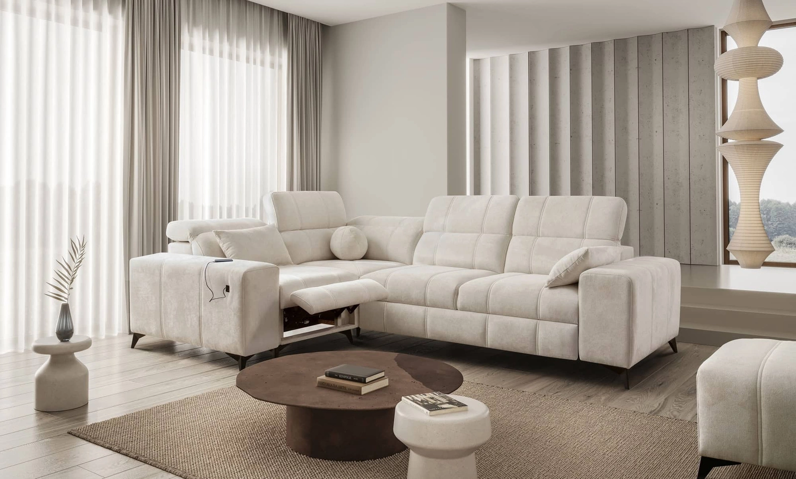 Dodatki tego mebla, które docenią wszyscy użytkownicy to wysuwany podnóżek, regulowane zagłówki, funkcja spania oraz gniazdo ładowania USB w boczku narożnika.
