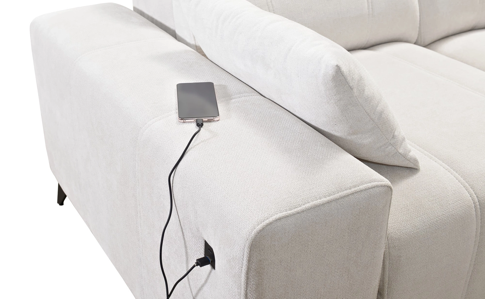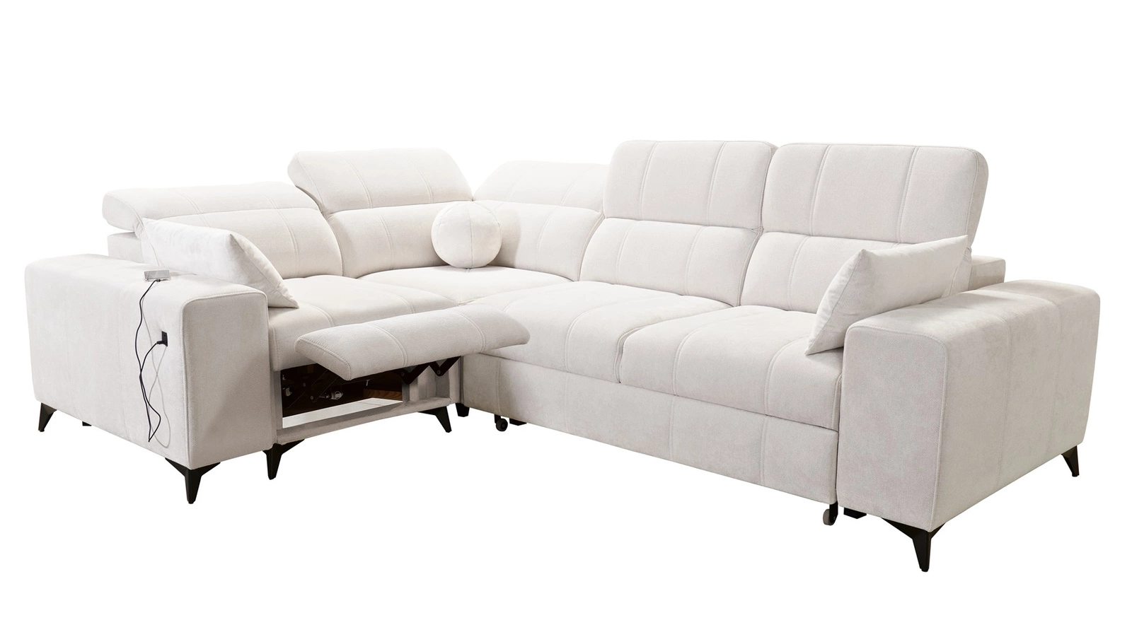 Dodatki tego mebla, które docenią wszyscy użytkownicy to wysuwany podnóżek, regulowane zagłówki, funkcja spania oraz gniazdo ładowania USB w boczku narożnika.