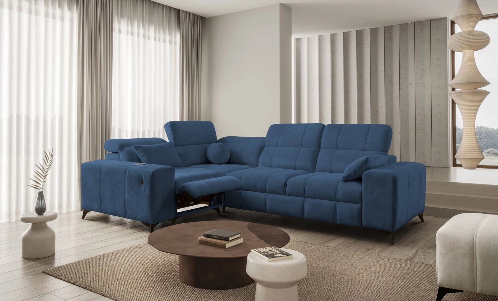 Narożnik Penejos II Lux w kolorze niebieskim z wysuwanym podnóżkiem to niezwykle komfortowy mebel o ciekawym wykończeniu.