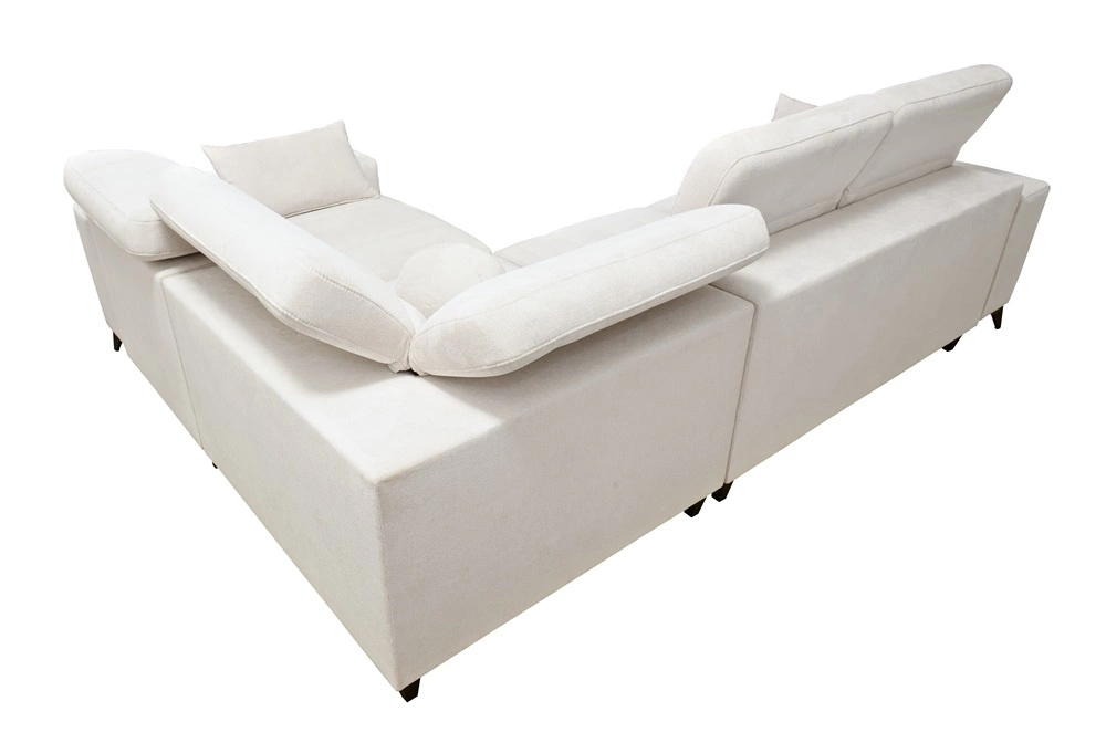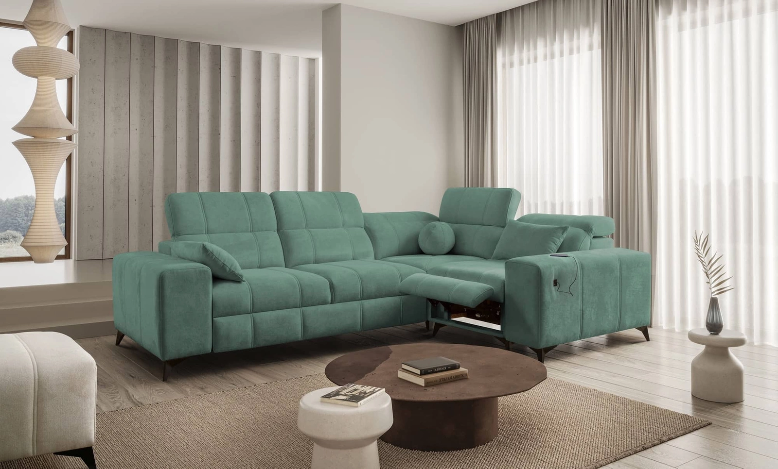 Dodatki tego mebla, które docenią wszyscy użytkownicy to wysuwany podnóżek, regulowane zagłówki, funkcja spania oraz gniazdo ładowania USB w boczku narożnika.