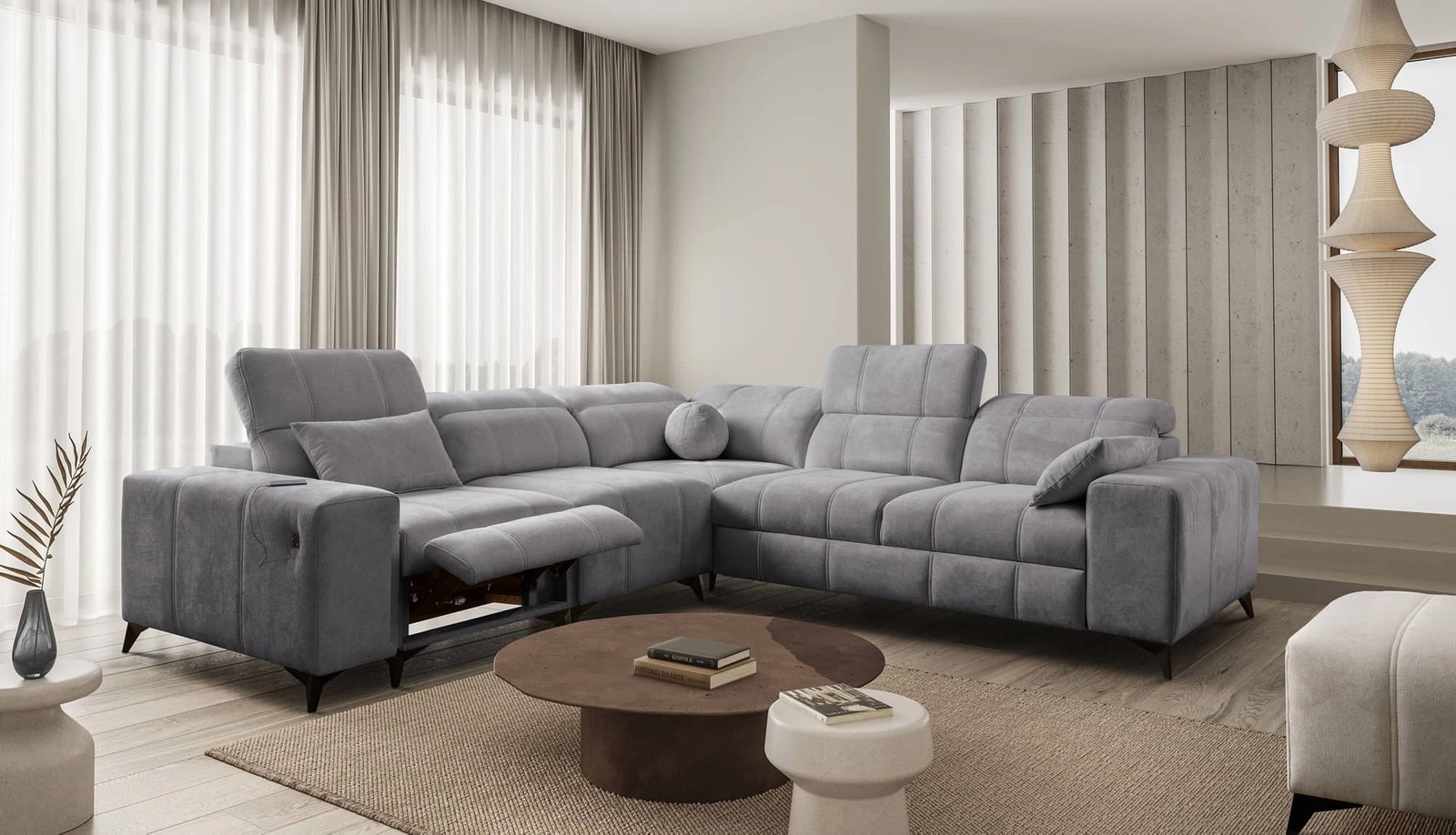 Narożnik Penejos III Lux w kolorze jasny szary z wysuwanym podnóżkiem to niezwykle komfortowy mebel o ciekawym wykończeniu.