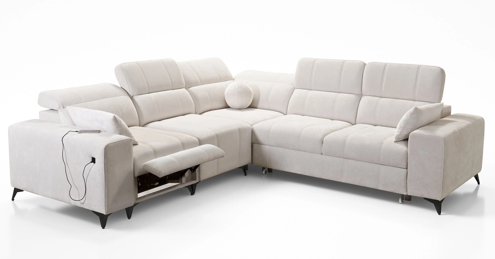 Dodatki tego mebla, które docenią wszyscy użytkownicy to wysuwany podnóżek, pojemnik na pościel, funkcja spania oraz gniazdo ładowania USB w boczku narożnika.