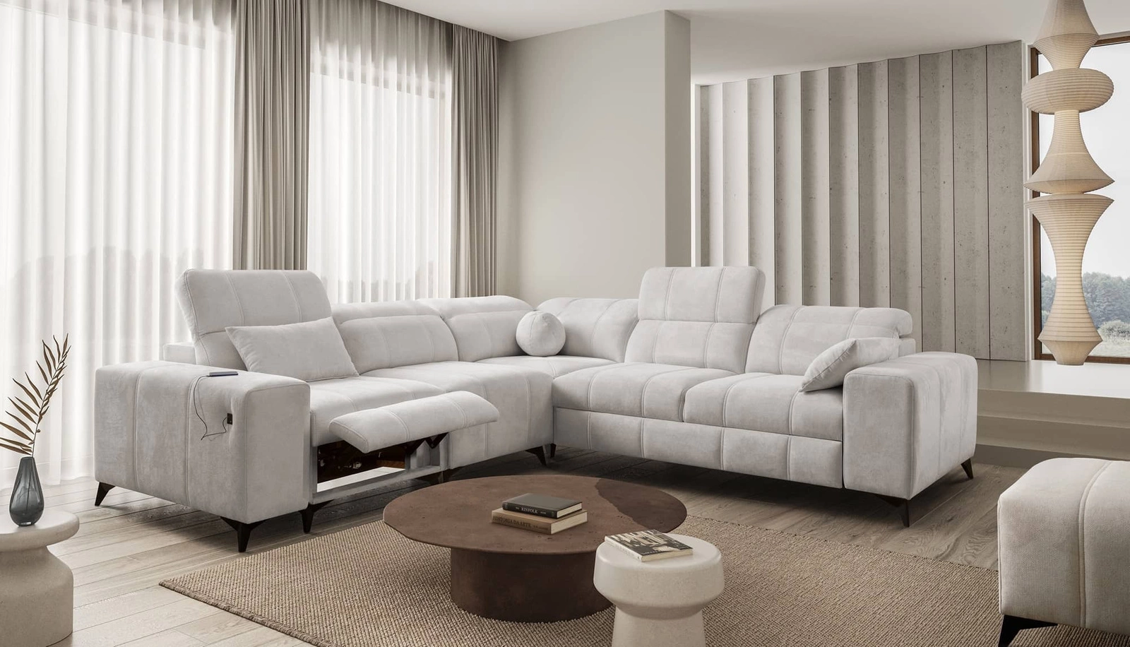 Narożnik Penejos III Lux w kolorze szary popiel z wysuwanym podnóżkiem to niezwykle komfortowy mebel o ciekawym wykończeniu.