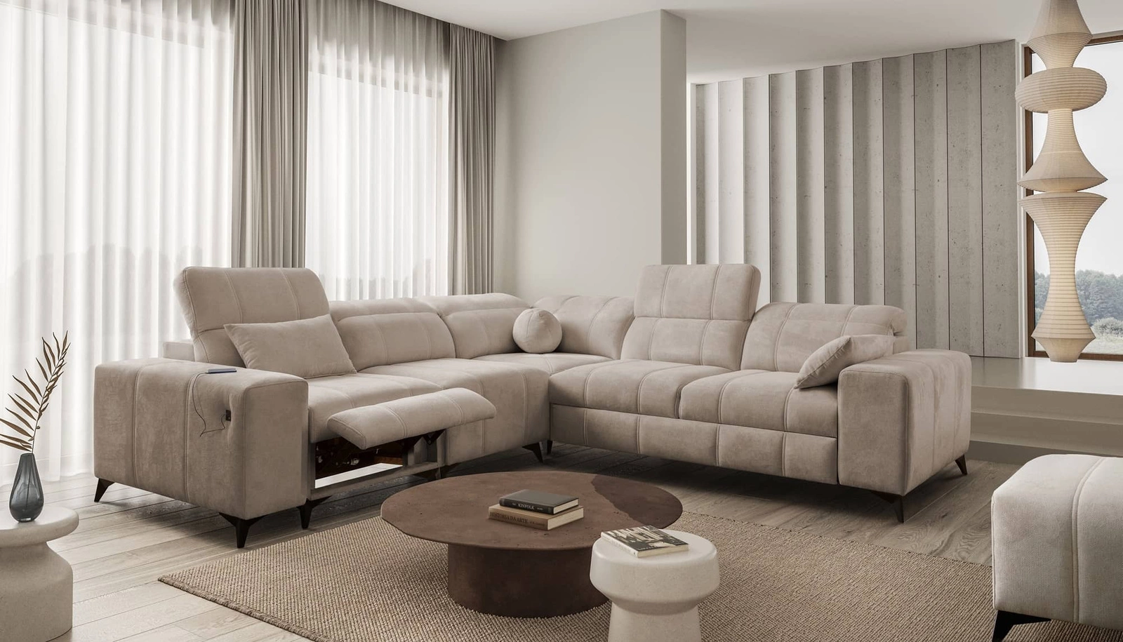 Narożnik Penejos III Lux w kolorze ciemny beżowy z wysuwanym podnóżkiem to niezwykle komfortowy mebel o ciekawym wykończeniu.