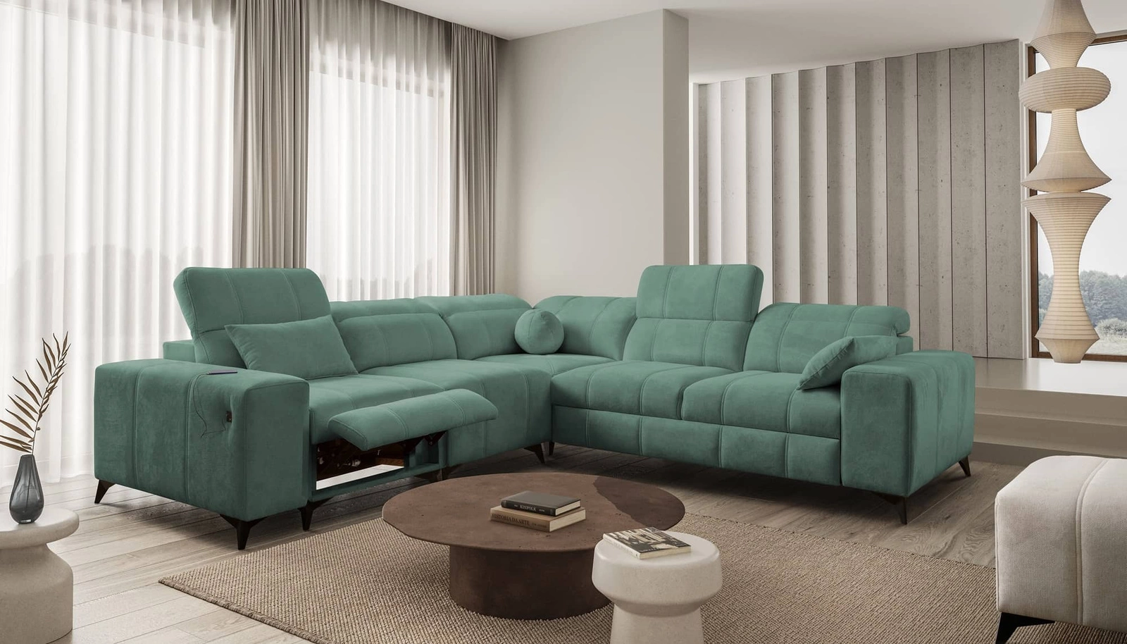 Narożnik Penejos III Lux w kolorze zielonym z wysuwanym podnóżkiem to niezwykle komfortowy mebel o ciekawym wykończeniu.