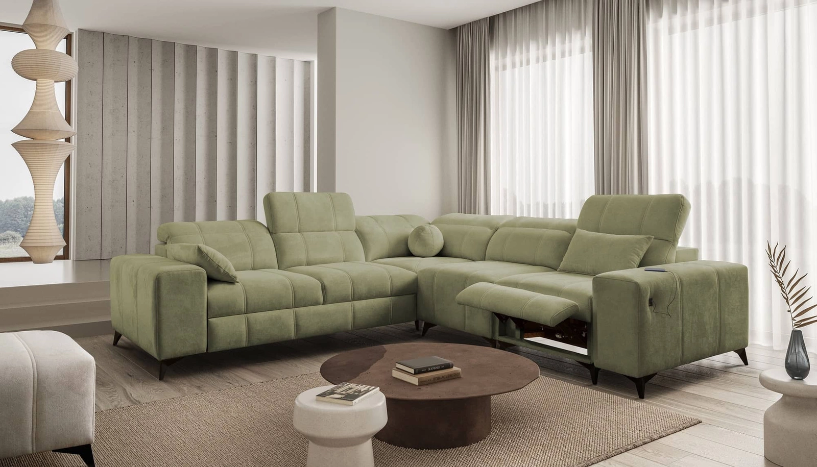 Narożnik Penejos III Lux w kolorze oliwkowym z wysuwanym podnóżkiem to niezwykle komfortowy mebel o ciekawym wykończeniu.