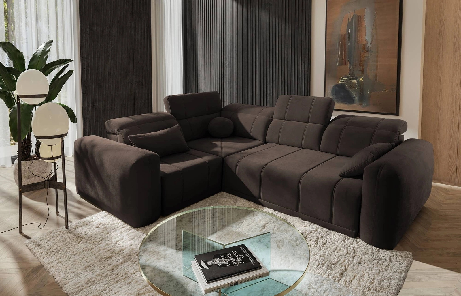Narożnik z funkcją spania Cetara II brązowy lewostronny stylowy design przesuwane oparcia regulowane zagłówki i pojemnik na pościel