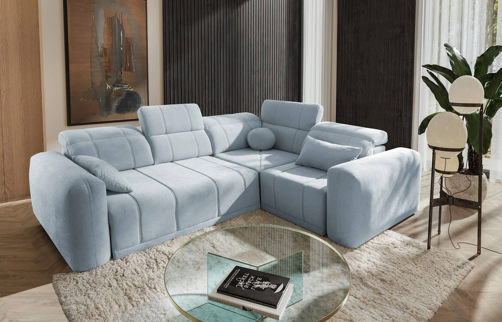 Narożnik z funkcją spania Cetara II błękitny prawostronny stylowy design przesuwane oparcia regulowane zagłówki i pojemnik na pościel