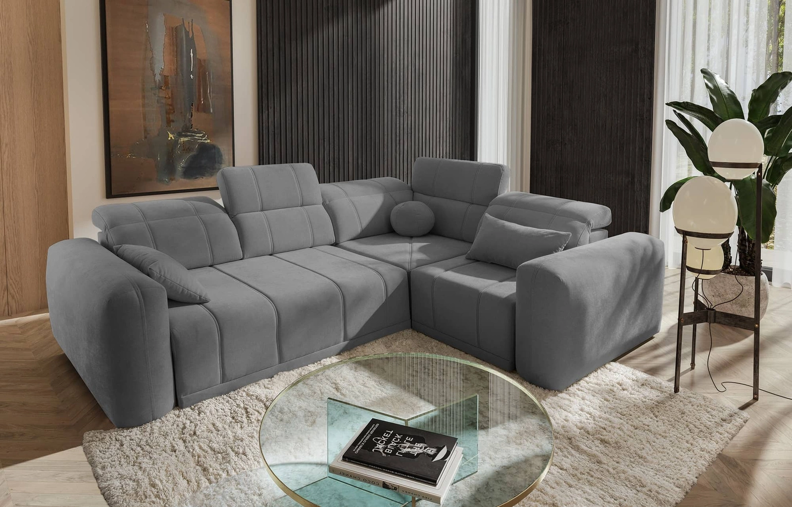 Narożnik z funkcją spania Cetara II szary prawostronny stylowy design przesuwane oparcia regulowane zagłówki i pojemnik na pościel
