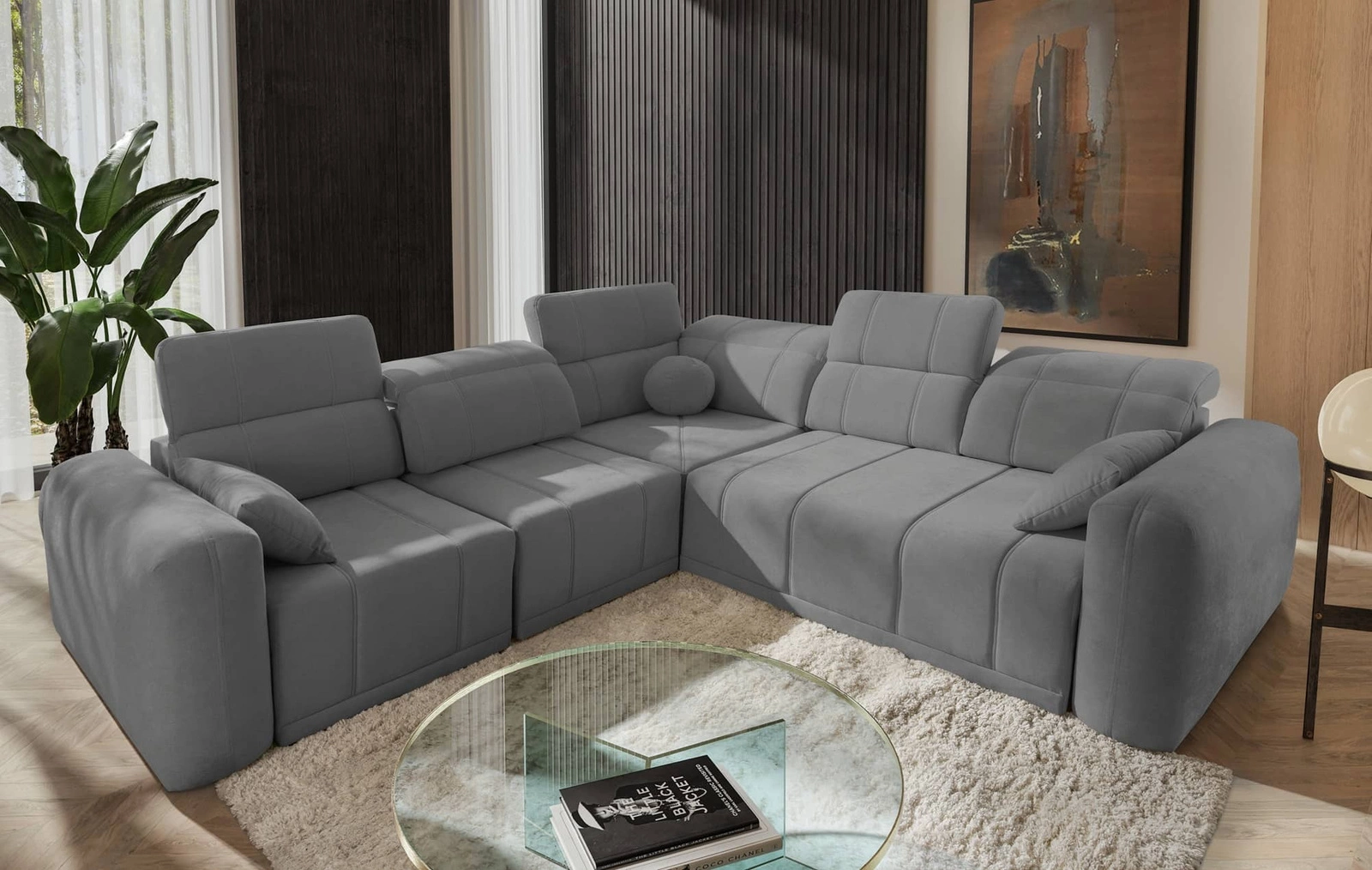 Narożnik z funkcją spania Cetara III szary lewostronny ergonomiczny narożnik z przesuwanym oparciem i regulowanymi zagłówkami