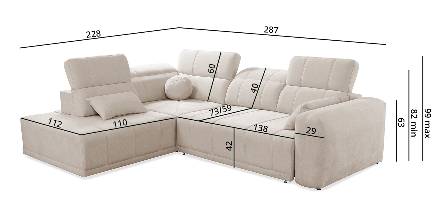 Wymiary mebla pozwolą na zapełnienie przestrzeni w przestronnym salonie lub pokoju dziennym. Szerokość narożnika 287 cm, wysokość maksymalna 99 cm oraz głębokość 228 cm. Powierzchnia spania narożnika wynosi 138x212 cm. Wysokość siedziska mebla to 42 cm a maksymalna wysokość oparcia wynosi 60 cm. Sprężyny faliste oraz pianka poliuretanowa T30 to materiał, z którego wykonane zostało siedzisko narożnika. Oparcie z regulowanymi zagłówkami pozwoli na łatwe dostosowanie kąta nachylenia zagłówków do swoich preferencji oraz daje gwarancję wygodnego wypoczynku po długim dniu, które docenisz Ty, Twoi bliscy a także goście, którzy zasiądą na tym wyjątkowym narożniku.