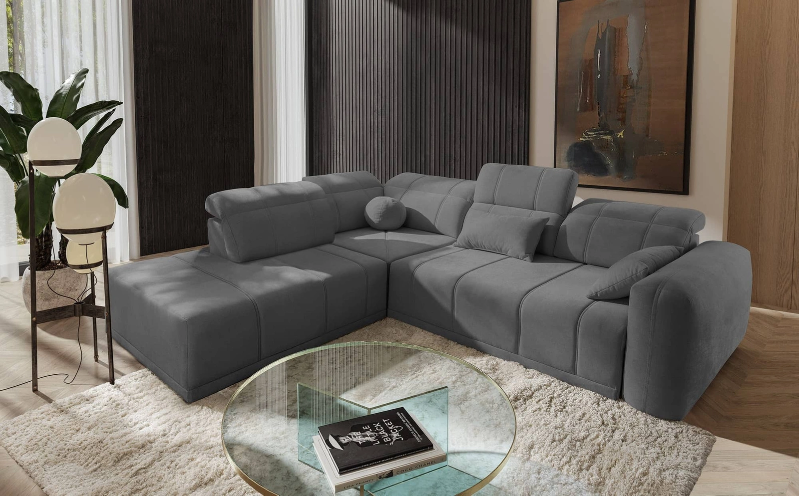 Narożnik z funkcją spania Cetara VII szary lewostronny wysokiej jakości narożnik do salonu z komfortowym przesuwanym oparciem