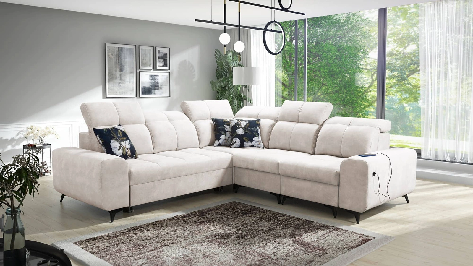Dodatki tego mebla, które docenią wszyscy użytkownicy to dwa pojemniki na pościel, regulowane zagłówki oraz gniazdo ładowania USB w boczku narożnika.