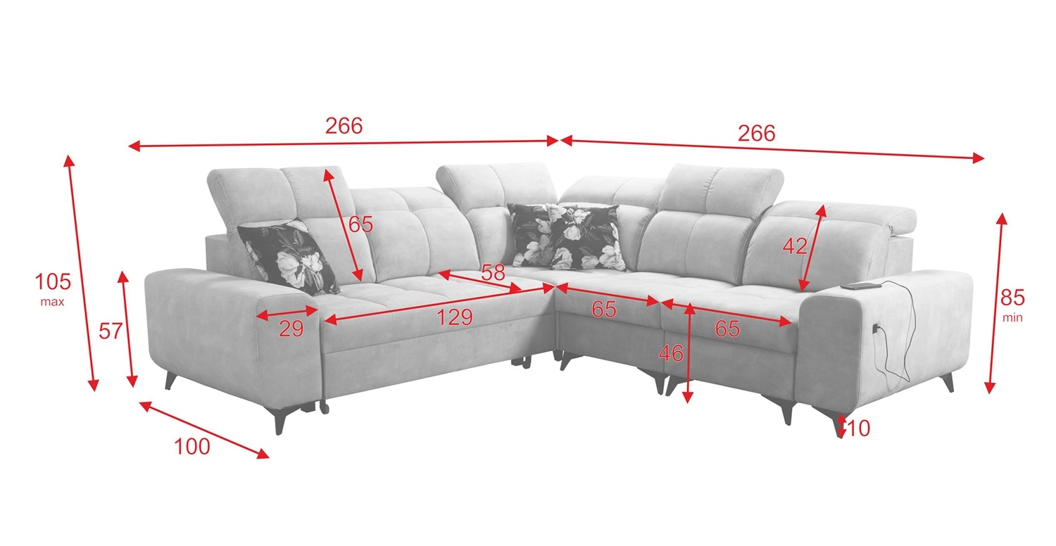Wymiary mebla pozwolą na zapełnienie przestrzeni w przestronnym salonie lub pokoju dziennym. Szerokość narożnika 266 cm, wysokość maksymalna 105 cm oraz głębokość 266 cm. Powierzchnia spania narożnika wynosi 129x190 cm. Wysokość siedziska mebla to 46 cm a maksymalna wysokość oparcia wynosi 65 cm. Sprężyny faliste oraz pianka poliuretanowa T30 to materiał, z którego wykonane zostało siedzisko narożnika. Oparcie stałe z regulowanymi zagłówkami pozwoli na łatwe dostosowanie kąta nachylenia zagłówków do swoich preferencji oraz daje gwarancję wygodnego wypoczynku po długim dniu, które docenisz Ty, Twoi bliscy a także goście, którzy zasiądą na tym wyjątkowym narożniku.