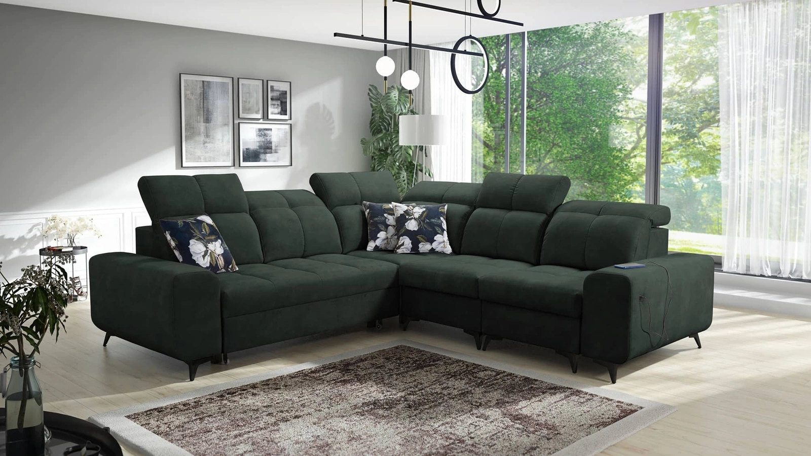 Narożnik Buffalo III w kolorze zielonym z regulowanymi zagłówkami to ciekawie prezentujący się mebel o eleganckim wykończeniu.