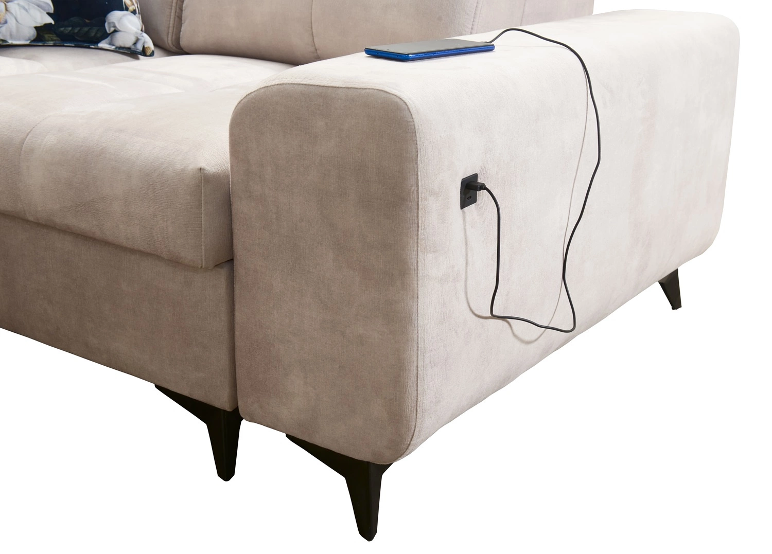 Dodatki tego mebla, które docenią wszyscy użytkownicy to dwa pojemniki na pościel, regulowane zagłówki oraz gniazdo ładowania USB w boczku narożnika.