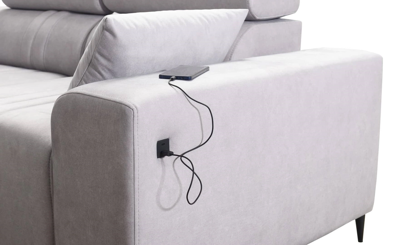 Dodatki tego mebla, które docenią wszyscy użytkownicy to pojemnik na pościel, regulowane zagłówki oraz gniazdo ładowania USB w boczku narożnika.