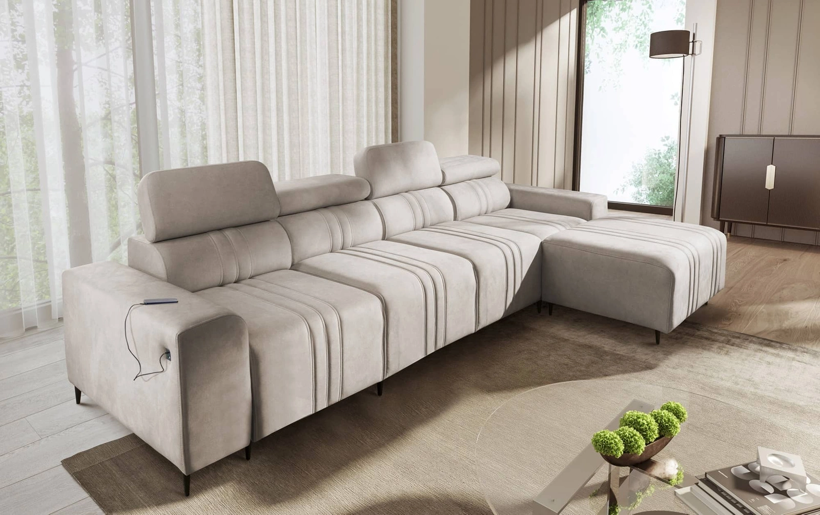 Narożnik z funkcją spania Castel XII beżowy prawostronny stylowy i wygodny narożnik do salonu funkcjonalne regulowane zagłówki
