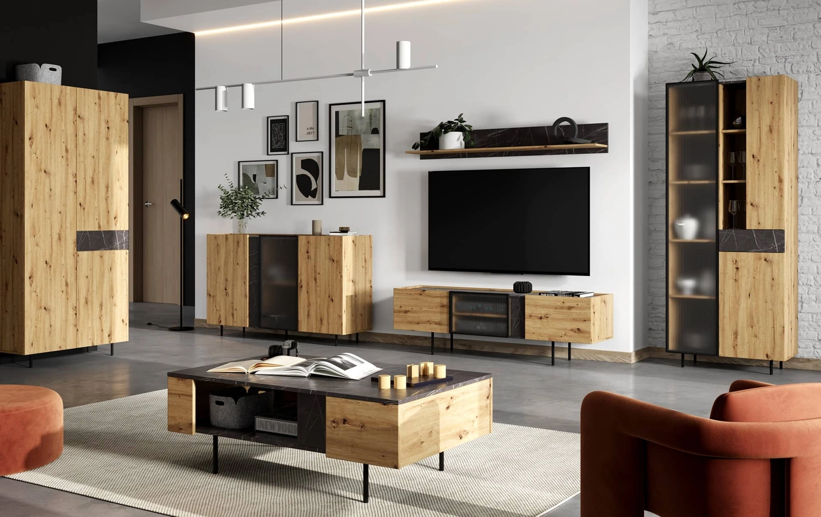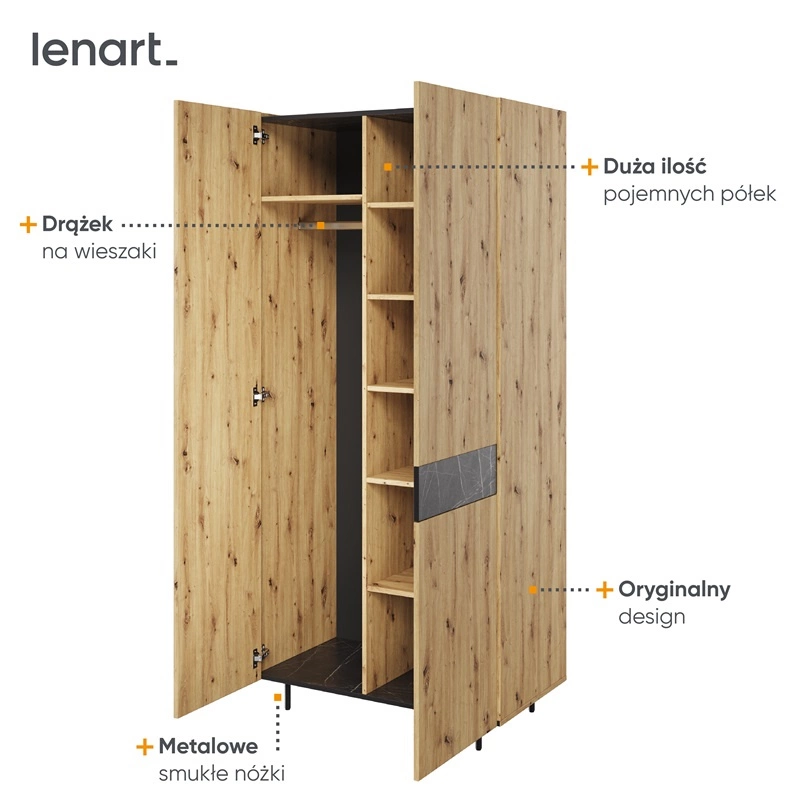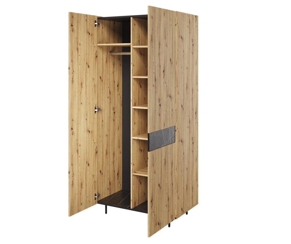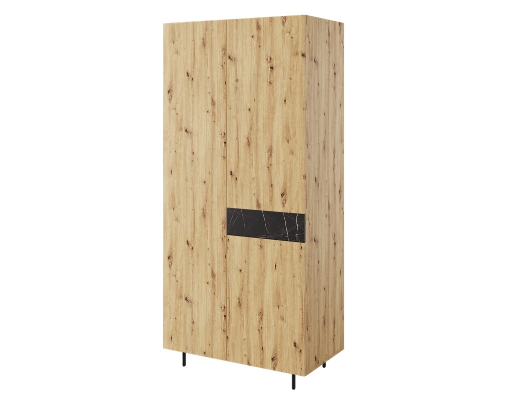Szafa uchylna Marmo łączy w sobie funkcjonalność z niezwykle wyjątkowym designem. Niebanalne połączenie dębu artisan z czarnym wzorem przypominającym powierzchnię marmuru doskonale oddaje luksusowy charakter bryły. Nowoczesny styl mebla to również zasługa smukłych, metalowych nóg, które nadają wizualnej lekkości przy jednoczesnym utrzymaniu funkcjonalności. Oprócz aspektów wizualnych szafa na ubrania wyróżnia się również funkcjonalnością, oferując dużo miejsca do przechowywania.