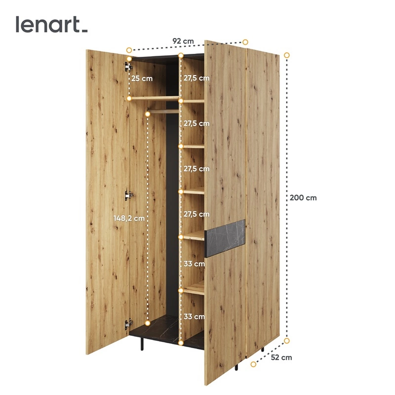 Szafa jest skonstruowana z 2 drzwi. Szafa gwarantuje komfortowe i bezproblemowe korzystanie oraz trwałość całego mebla przez wiele lat użytkowania. Ciepłe wybarwienie dębu świetnie odnajdzie się w modnych aranżacjach, dzięki czemu szafa na ubrania z powodzeniem sprawdzi się jako szafa do sypialni, jako szafa do przedpokoju lub szafa do pokoju młodzieżowego. Szafa Marmo będzie również świetnym wyborem do biura. Doskonale sprawdzi się także w roli garderoby do przedpokoju.