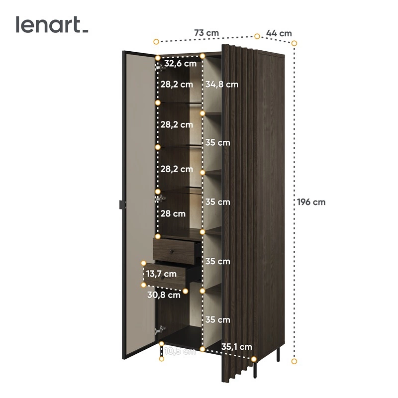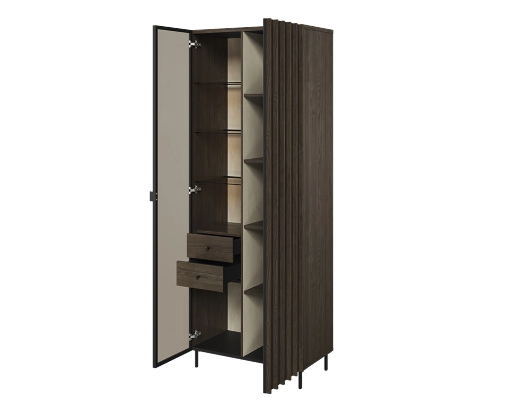 Witryna loft jest skonstruowana z 2 drzwi oraz 2 szuflad. Solidne i staranne wykończenie sprawia, że mebel będzie służyć przez wiele lat, zachowując swoją funkcjonalność i estetykę. Zdecydowana, głęboka kolorystyka świetnie odnajdzie się w odważnych aranżacjach, dzięki czemu witryny szklane z kolekcji Piemonte doskonale sprawdzą się w roli witryny do salonu, witryny do jadalni lub witryny na książki.