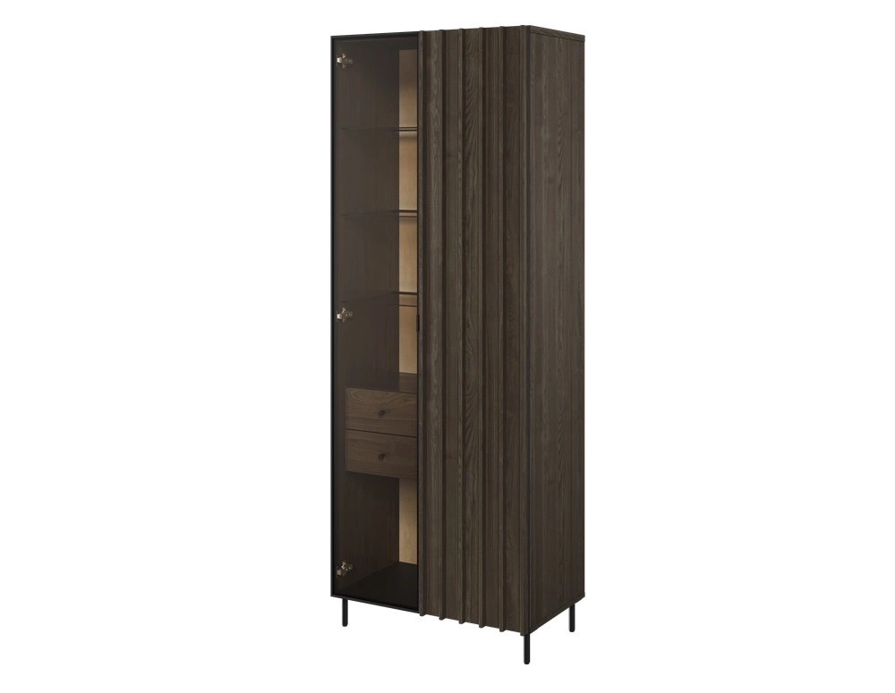 Witryna Piemonte 73 cm jesion portland / czarny elegancka witryna szklana z ukrytymi we wnętrzu szufladami i oświetleniem led