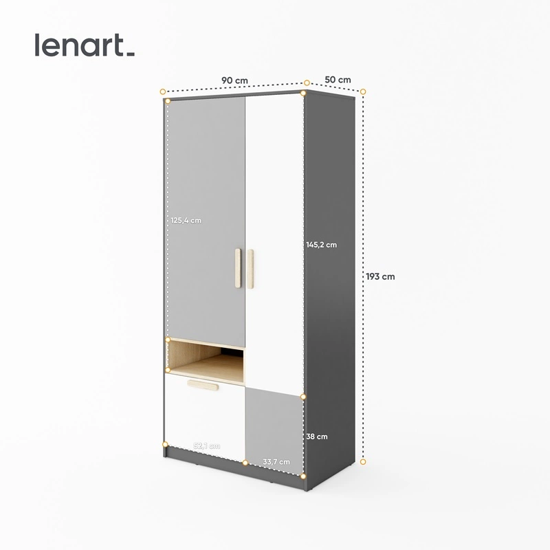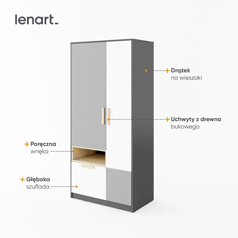 Szafa do pokoju młodzieżowego jest skonstruowana z 2 drzwi, 1 szuflady i głębokiej wnęki. Solidne i staranne wykończenie sprawia, że mebel będzie służyć przez wiele lat, zachowując swoją funkcjonalność i estetykę. Szare wybarwienie z kontrastującą bielą oraz drewnem sprawia, że szafa na ubrania z powodzeniem sprawdzi się jako szafa do pokoju dziecięcego, szafa do sypialni lub jako szafa do przedpokoju. Szafa uchylna będzie także świetnym wyborem do pokoju niemowlęcego. Doskonale sprawdzi się także w roli garderoby do przedpokoju.
