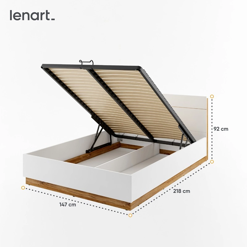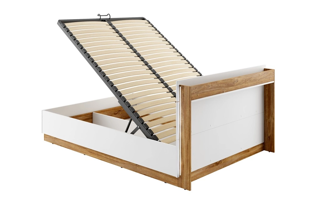 Łóżka do sypialni z kolekcji Dentro wyposażone są w stabilny, metalowy stelaż pod materac. Łatwe i lekkie otwieranie ramy z materacem zapewniają podnośniki gazoweIdealnie połączenie bieli i detali w kolorze drewna sprawia, że łóżko z pojemnikiem świetnie sprawdzi się jako łóżko do sypialni lub łóżko młodzieżowe w pokoju nastolatka.