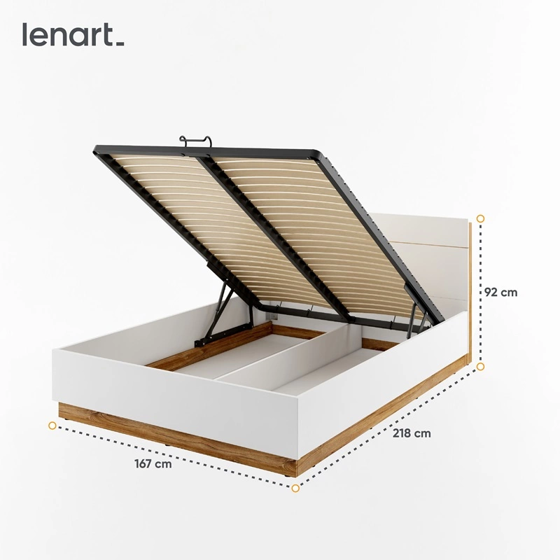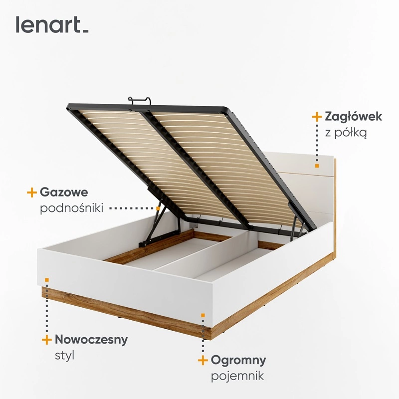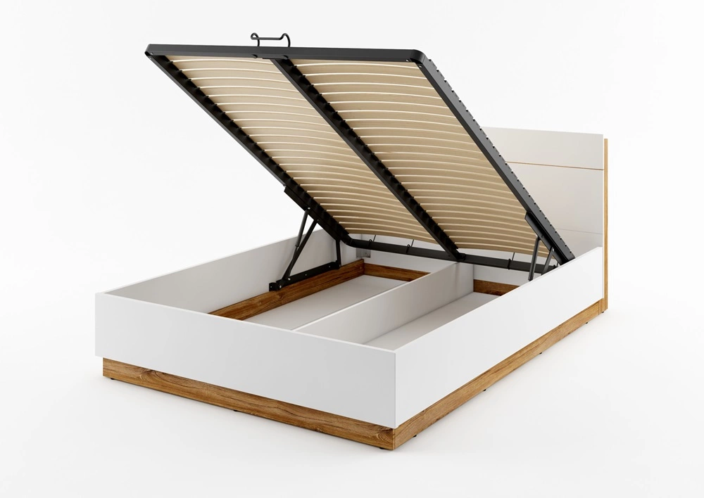 Łóżka do sypialni z kolekcji Dentro wyposażone są w stabilny, metalowy stelaż pod materac. Łatwe i lekkie otwieranie ramy z materacem zapewniają podnośniki gazowe. Idealnie połączenie bieli i detali w kolorze drewna sprawia, że łóżko z pojemnikiem świetnie sprawdzi się jako łóżko do sypialni lub łóżko młodzieżowe w pokoju nastolatka.
