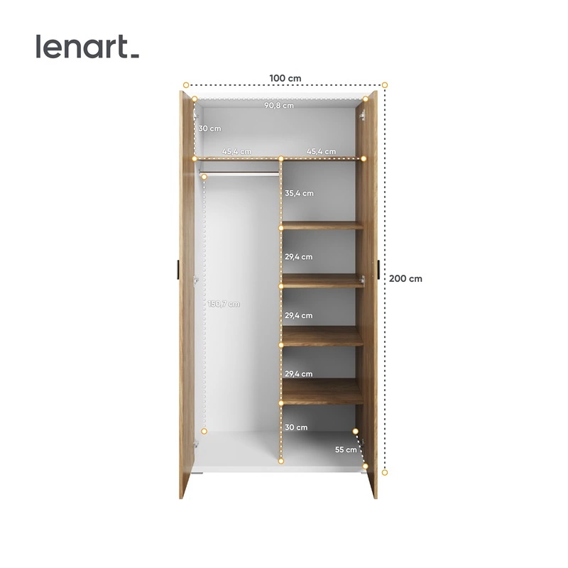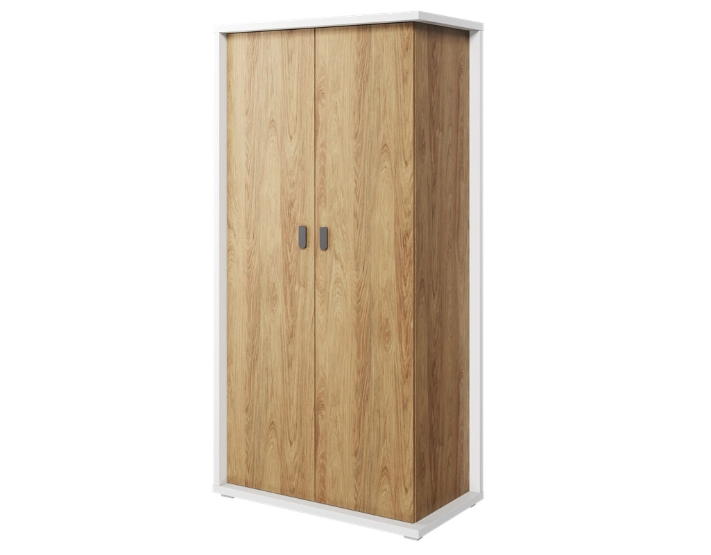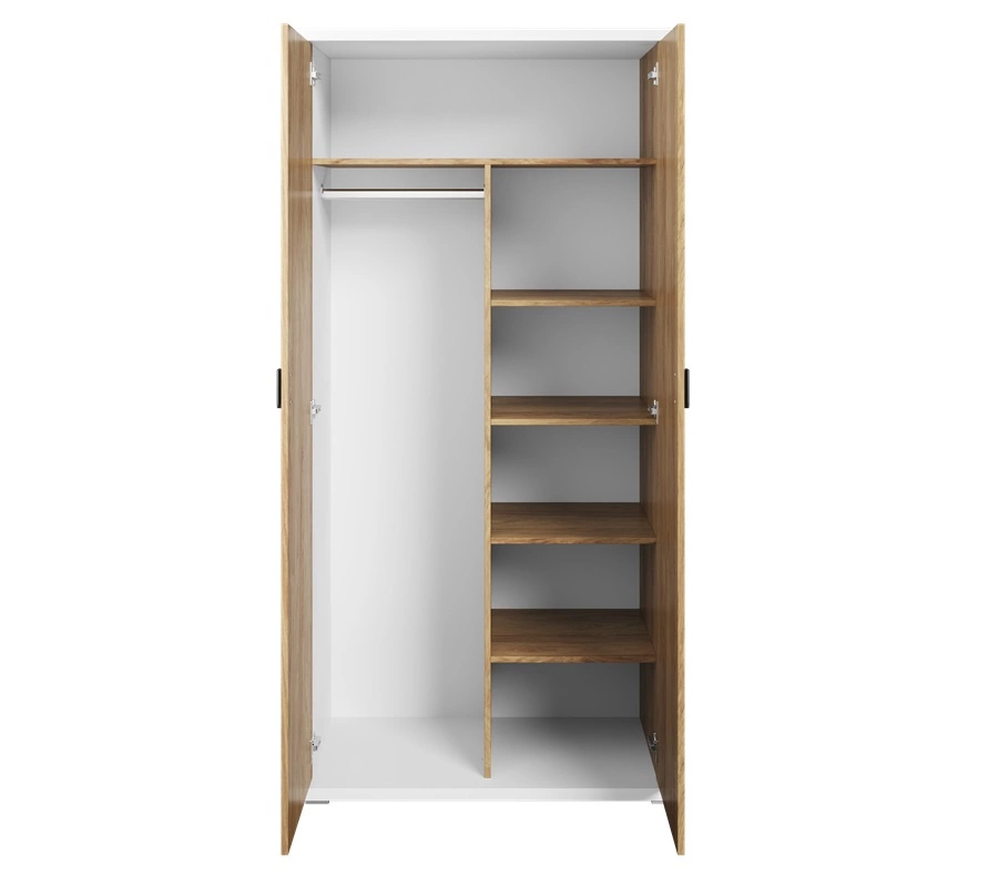 Szafa jest skonstruowana z 2 drzwi uchylnych. Solidne i staranne wykończenie sprawia, że mebel będzie służyć przez wiele lat, zachowując swoją funkcjonalność i estetykę. Połączenie bieli i dekoru o barwie drewna sprawia, że szafa ubraniowa z powodzeniem sprawdzi się jako szafa do pokoju dziecięcego, szafa do sypialni lub jako szafa do przedpokoju. Szafa uchylna będzie także świetnym wyborem do pokoju niemowlęcego. Doskonale sprawdzi się także w roli garderoby do przedpokoju.