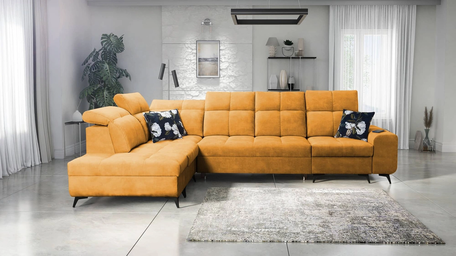 Narożnik Buffalo XI w kolorze żółtym z regulowanymi zagłówkami to ciekawie prezentujący się mebel o eleganckim wykończeniu.