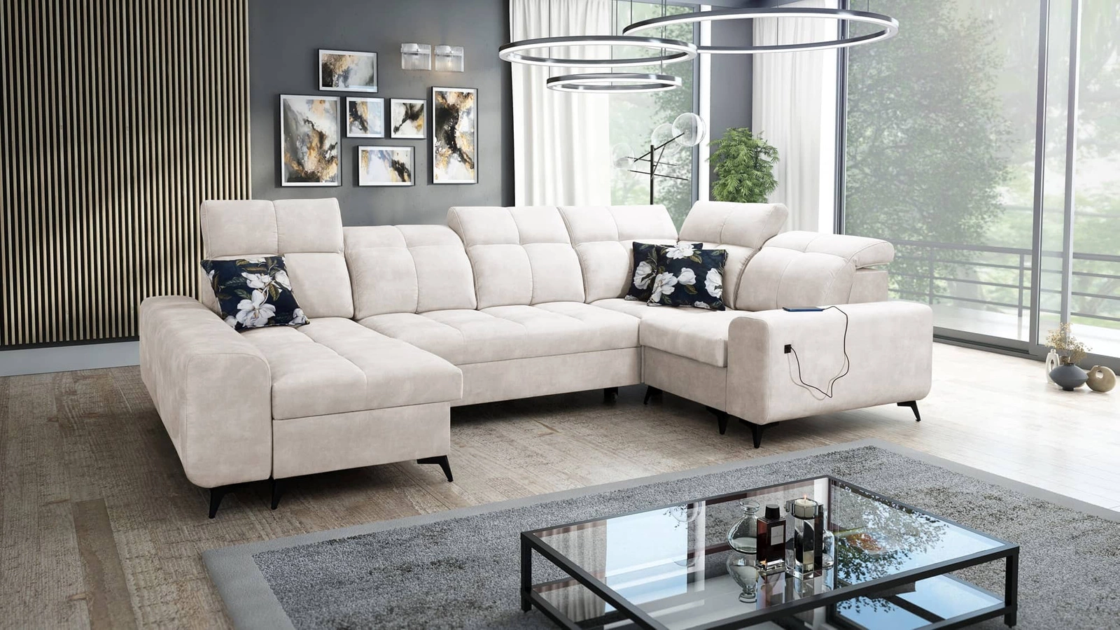 Dodatki tego mebla, które docenią wszyscy użytkownicy to aż dwa pojemniki na pościel, regulowane zagłówki oraz gniazdo ładowania USB w boczku narożnika.