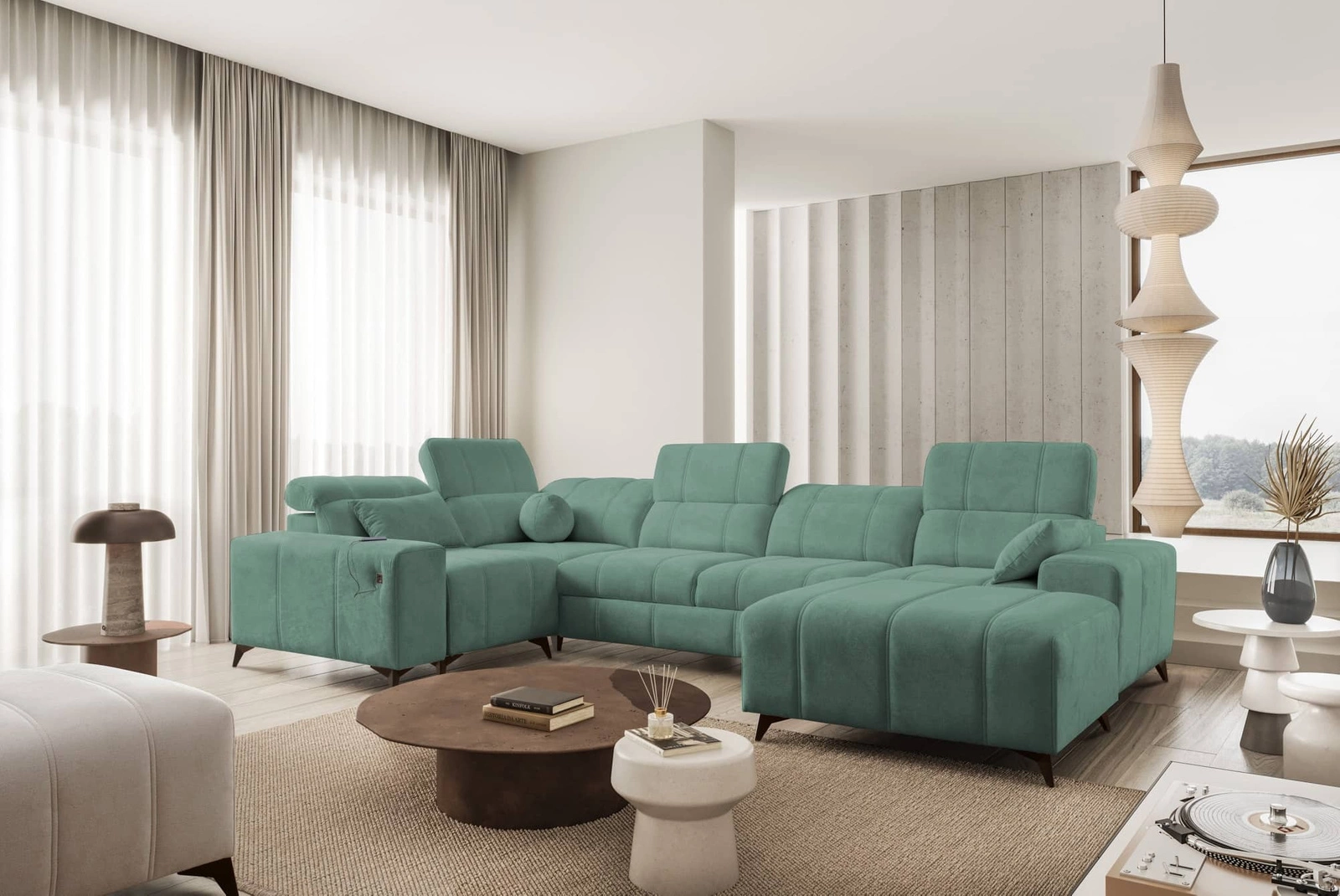 Narożnik Penejos IV w kolorze zielonym z regulowanymi zagłówkami to zachwycający mebel z gwarancją najwyższego komfortu i funkcjonalności.