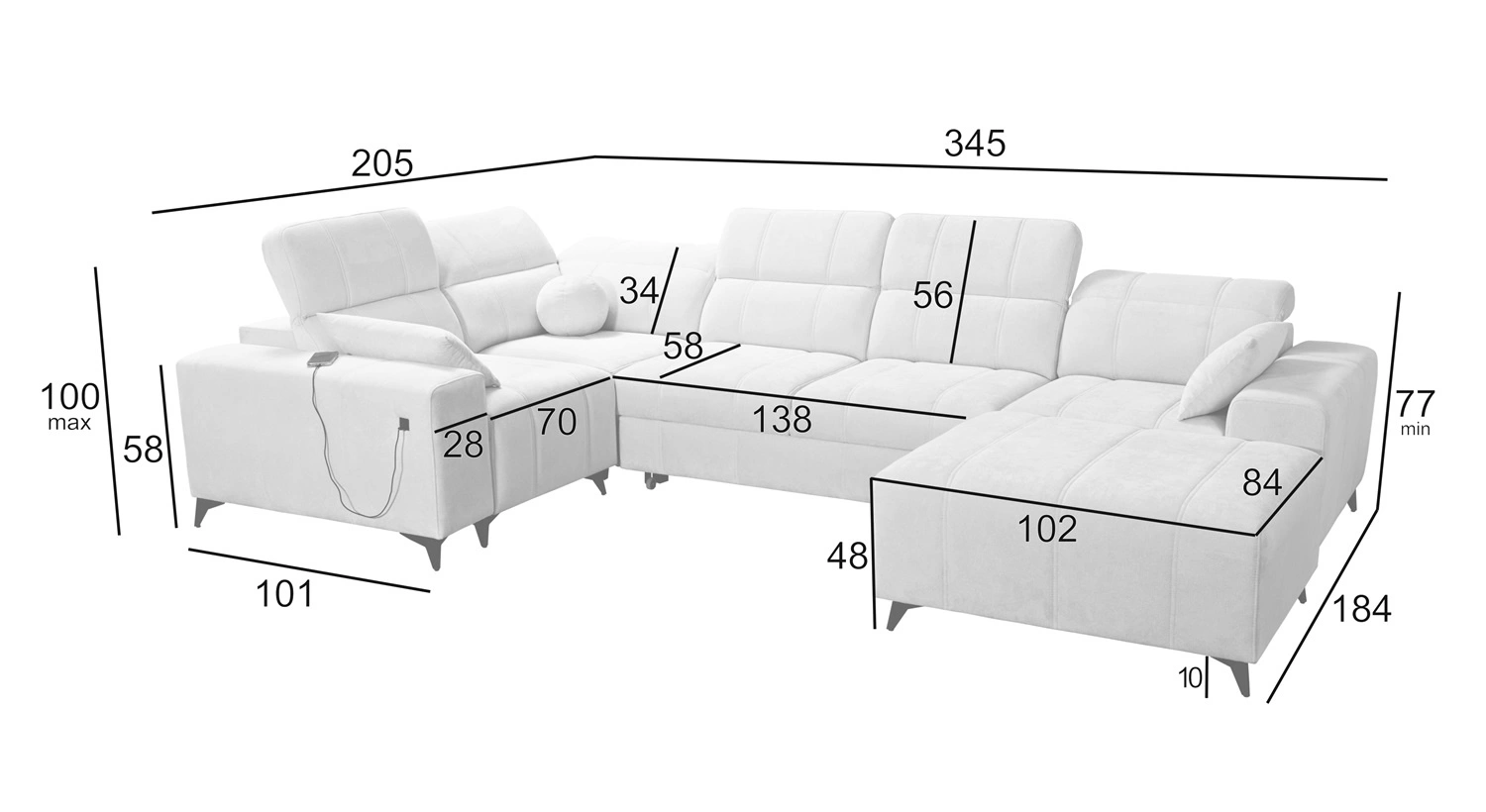 Wymiary mebla pozwolą na zapełnienie przestrzeni w przestronnym salonie lub pokoju dziennym. Szerokość narożnika 345 cm, wysokość maksymalna 100 cm oraz głębokość 205 cm. Powierzchnia spania narożnika wynosi 127x268 cm. Wysokość siedziska mebla to 48 cm a maksymalna wysokość oparcia wynosi 56 cm. Sprężyny faliste oraz pianka poliuretanowa T30 to materiał, z którego wykonane zostało siedzisko narożnika. Oparcie stałe z regulowanymi zagłówkami pozwoli na łatwe dostosowanie kąta nachylenia zagłówków do swoich preferencji oraz daje gwarancję wygodnego wypoczynku po długim dniu, które docenisz Ty, Twoi bliscy a także goście, którzy zasiądą na tym wyjątkowym narożniku.