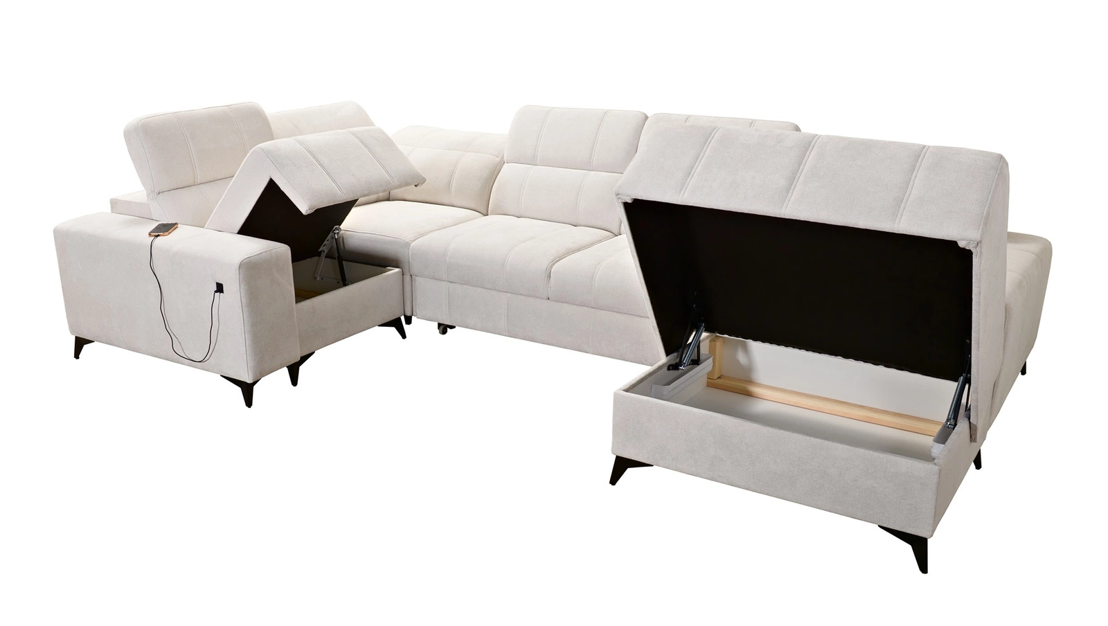 Dodatki tego mebla, które docenią wszyscy użytkownicy to dwa pojemniki na pościel, funkcja spania oraz gniazdo ładowania USB w boczku narożnika.