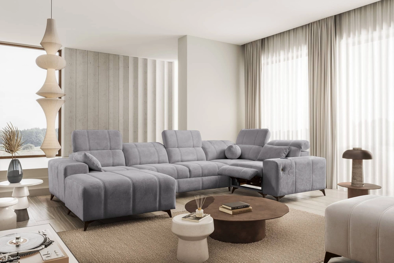 Narożnik Penejos IV Lux w kolorze jasny szary z wysuwanym podnóżkiem to niezwykle komfortowy mebel o ciekawym wykończeniu.
