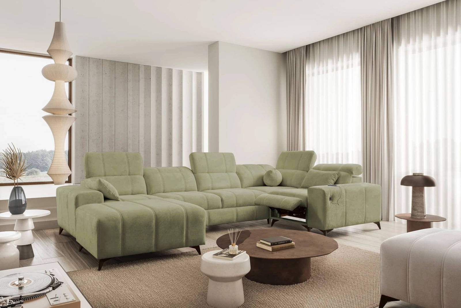 Narożnik Penejos IV Lux w kolorze oliwkowym z wysuwanym podnóżkiem to niezwykle komfortowy mebel o ciekawym wykończeniu.